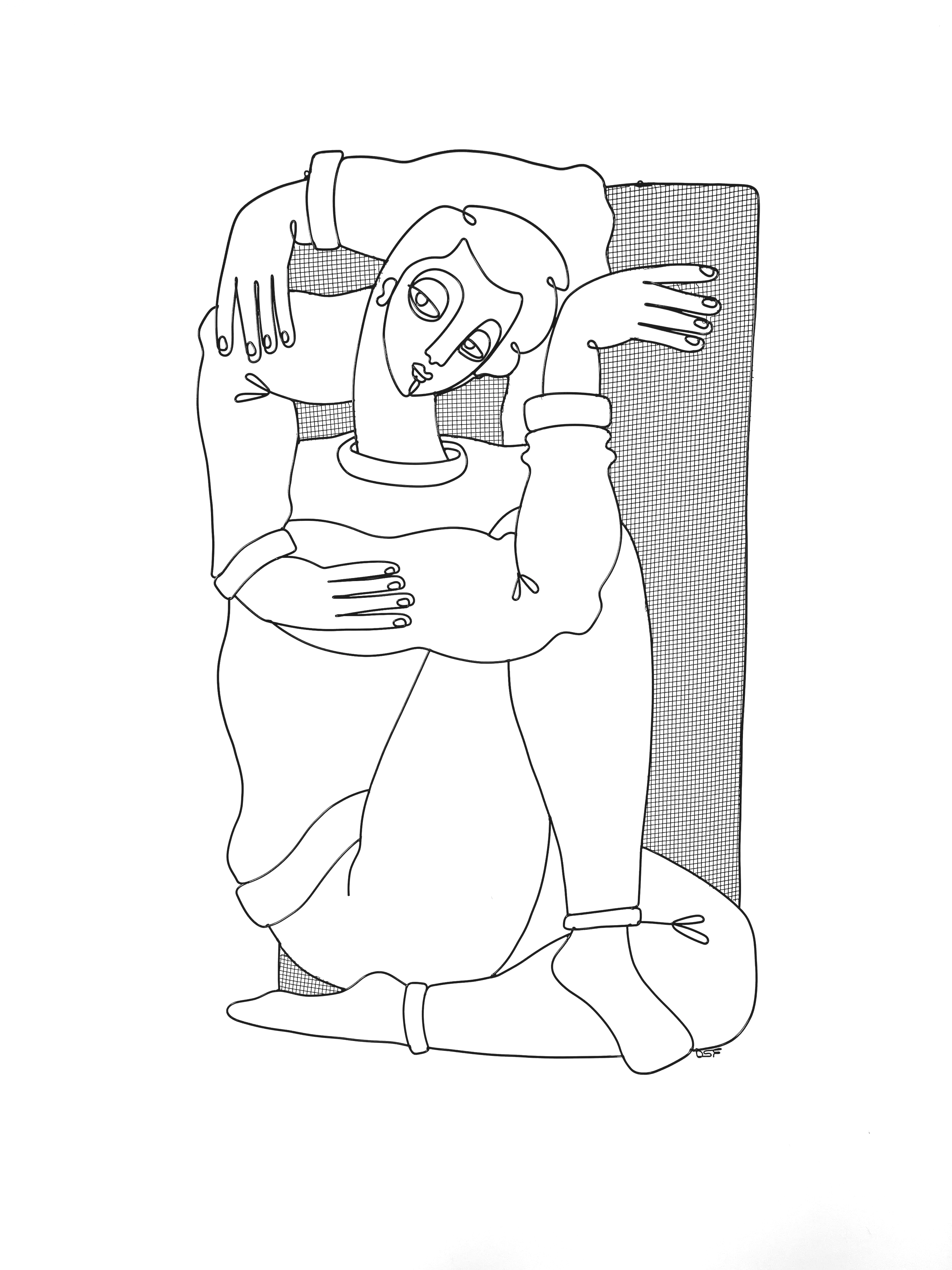 Tabletop sculptures in powder-coated steel that balance on the edge of gesture. Seated figures, leaning bodies, quiet moments caught mid-thought. From early single-strand experiments to the richly titled works of recent years.